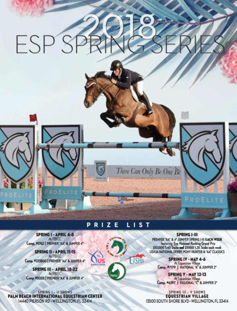 The 2018 Equestrian Sport Productions (ESP) Spring Series will begin at Palm Beach International Equestrian Center (PBIEC) on Wednesday, April 4, and will feature five weeks of top hunter, jumper, and equitation competition following the twelve-week Winter Equestrian Festival (WEF) circuit. The final two weeks of the circuit will be hosted at Equestrian Village, the home of the Adequan® Global Dressage Festival (AGDF), located at 13500 South Shore Boulevard. The ESP Spring Series will officially conclude on Sunday, May 13.